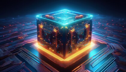 Abstract geometric composition with blue and white cubic structures and glowing lines