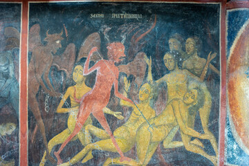 cloister with fresco decoration, purgatory scene, Rila Monastery, founded in the 10th century, Rilski River valley, Republic of Bulgaria, Europe