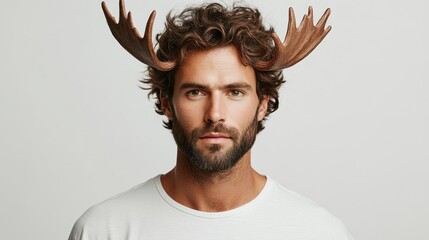 portrait of serious handsome man in white t-shirt with moose antlers on head on white background