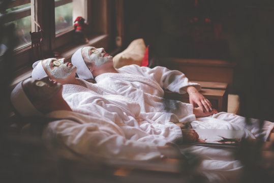 Spa. Beautiful young woman is getting facial clay mask at spa, lying with cucumbers on eyes
