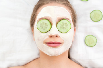 Beautiful young woman receiving facial mask of cucumber in beaut