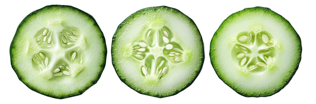 Two whole cucumbers and five sliced cucumber rounds isolated on transparent background