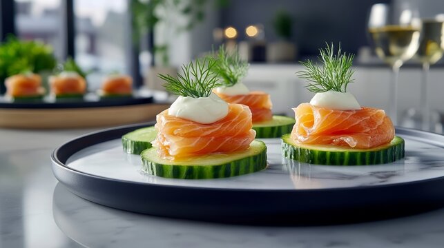 Smoked salmon and dill cream cheese canape on cucumber slice