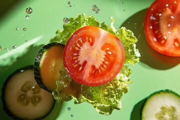 Fresh garden salad with tomato, cucumber, and lettuce garnished with herbs