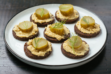 Homemade sandwiches with salted herring, cucumber and egg on round plate