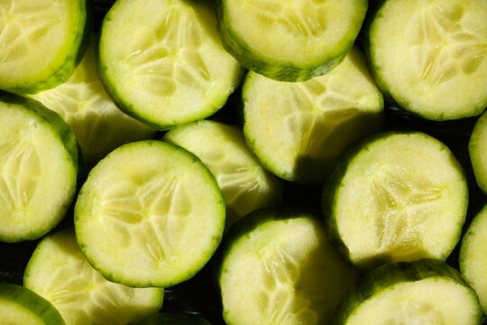 Close-up of fresh hydrating cucumber slices for culinary or skincare use