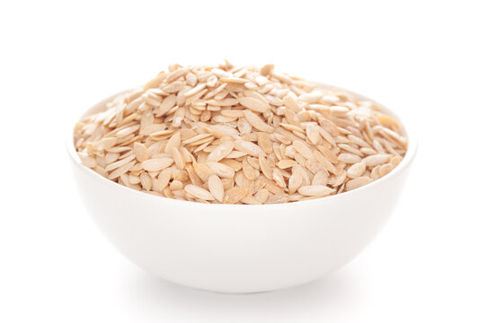 Close-up of white dry muskmelon (Cucumis melo) seed  in a white ceramic bowl over white background.