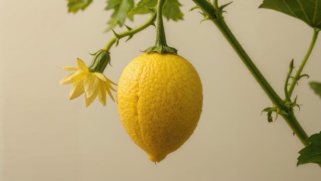 A solitary Lemon Cucumber (Cucumis sativus) developing on the vine with its blossom still connected