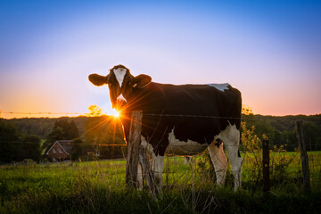 A dairy cow in front of setting sun in a filed of farmland grazing on lush green grass at sunset. Belgium summer in rural Ardennes where animals like this are farmed for livestock produce like milk