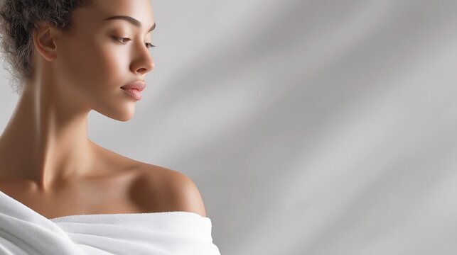 Relaxed woman wrapped in towel with closed eyes and soft fabric, tranquil spa atmosphere, aroma and hydration cues for wellness and selfcare