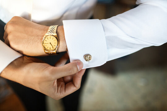 Dress cod. Man adjusting cufflink on formal shirt
