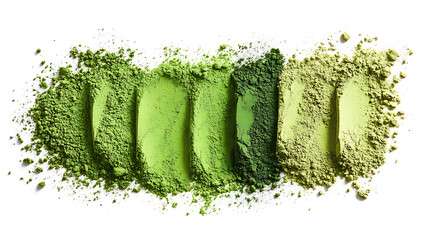 Vibrant green matcha powder displayed in textured strips on white backdrop revealing color variations and ingredient closeup for culinary and wellness applications