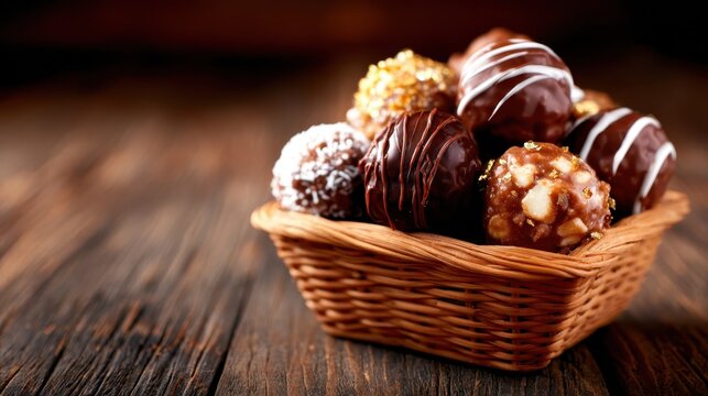 A tempting display of assorted chocolate treats beautifully arranged in a woven basket, evoking indulgence and delight in a warm, inviting setting perfect for dessert lovers.