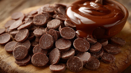 Chocolate chips and melted chocolate create a rich indulgent scene, symbolizing sweetness comfort and culinary delight with smooth textures and warm brown tones