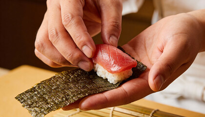 Expert chef preparing fresh sushi roll with precision