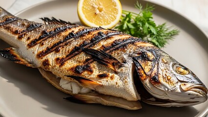 A perfectly grilled whole fish, seasoned and cooked to perfection, served with fresh lemon and herbs, a culinary delight