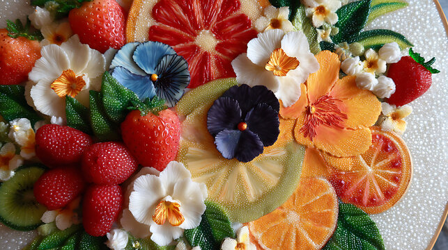 Vibrant mosaic of pancake art is feast for eyes, bursting with fresh fruit and delicate edible flowers. truly joyful and artistic dessert