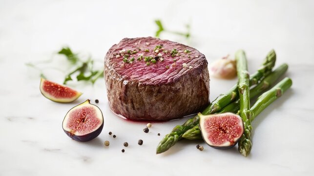 Juicy filet mignon with figs and asparagus - perfect for gourmet food blogs, restaurant websites, fine dining menus, or culinary photography portfolios