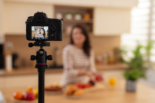 online culinary show. blogging and live video streaming. chef showing the process of blueberry pie cooking.