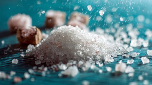 Close-up salt crystals on turquoise surface for kitchen ingredient styling and culinary product presentation image