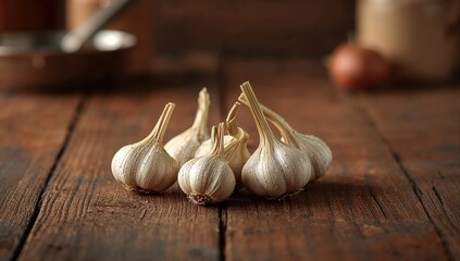 Garlic arranged on rustic wooden table, ideal for food styling and culinary background applications, highlighting health-conscious cooking