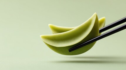 Green dumplings held by chopsticks against a soft pastel background, showcasing culinary artistry and vibrant food presentation techniques
