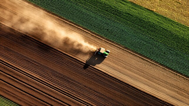 Aerial view of a tractor working on a dust-filled agricultural field.