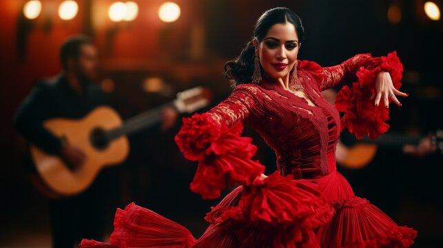 Passionate flamenco dancer in flowing red dress performing dramatic traditional dance, artistic photography with atmospheric lighting and dynamic movement against textured backdrop
