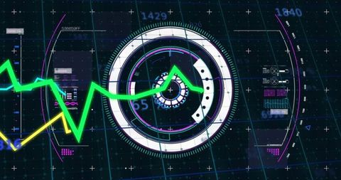 Futuristic hud displaying rotating concentric hub with neon waveform analytics and holographic grid