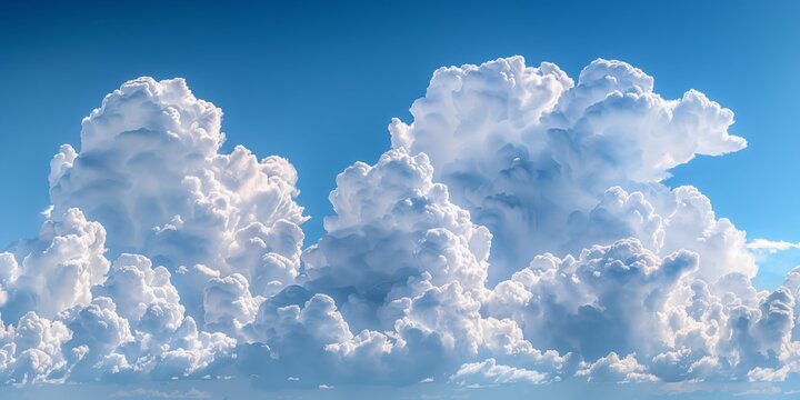 A panoramic image showcasing large, billowing cumulus clouds against a bright blue sky. The image captures the grandeur and beauty of these towering clouds, creating a sense of awe and wonder.