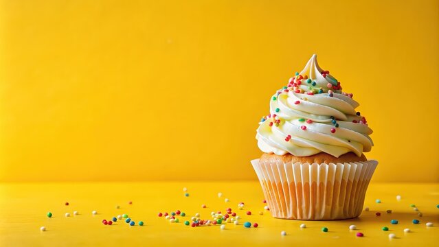Birthday cupcake with sprinkles on a bright yellow background, birthday, cupcake, celebration, dessert, party, confetti