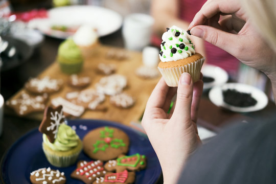 Senior woman arranging cupcakes for special gathering in modern kitchen