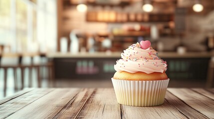 Row of colorful cupcakes on a wooden counter in a pastel-toned shop