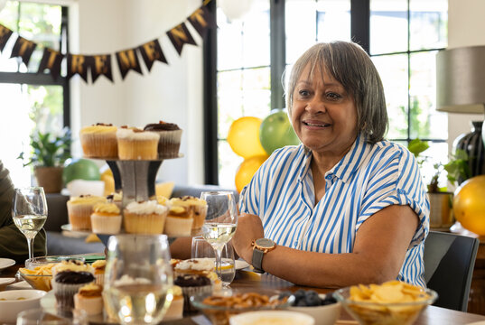 Smiling Senior woman enjoying retirement party with cupcakes and wine at home