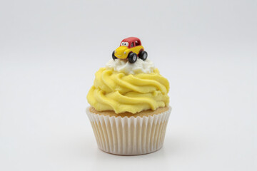 Birthday creamy cupcake with lightning candle. Anniversary pastry confection with glowing candle.