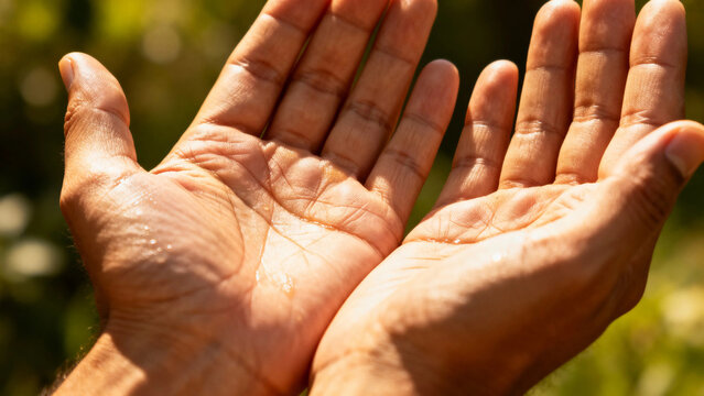 Open hands cupped together in natural sunlight, showing detailed skin texture and lines
