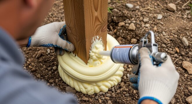 Overtheshoulder view of craftsman applying thick foam around fence post hole before curing process begins.