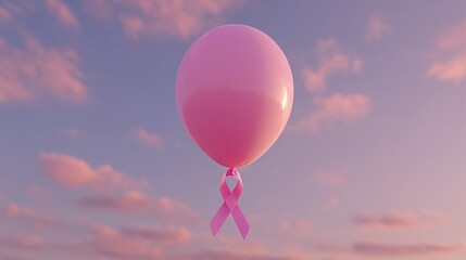 Pink balloon with a ribbon for breast cancer awareness floating in a pastel sky, symbolizing hope and support for a cure and research efforts