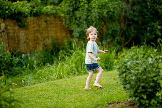 Adorable little boy having fun outdoors on sunny summer day. Kid running outdoors. Child exploring nature. Summer activities for small kids.