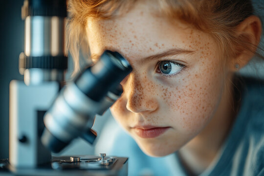 A curious child with red hair and freckles exploring through a microscope.
