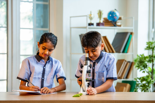 Uniformed Indian students examine plant samples under microscope and take notes in science class