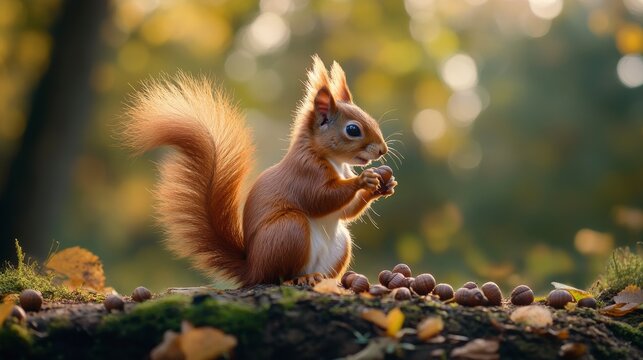 A curious squirrel forages for acorns amidst autumn leaves, basking in golden sunlight filtering through the trees in a serene forest setting.