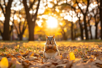 Curious squirrel holds a nut in a park with autumn leaves during sunset hours