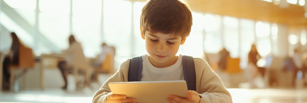 Focused Young Boy Engaged with Tablet in Classroom, Exploring Digital Education and Interactive Learning