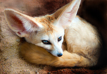 Portrait of a Fennec Fox curled up in the sand, South Africa