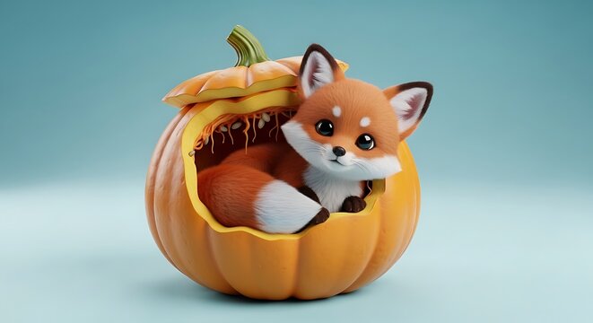 Adorable cartoon fox curled up inside a carved pumpkin against a soft blue background celebrating autumn and halloween