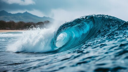 Powerful turquoise ocean wave curling into a barrel near mountains under a cloudy sky