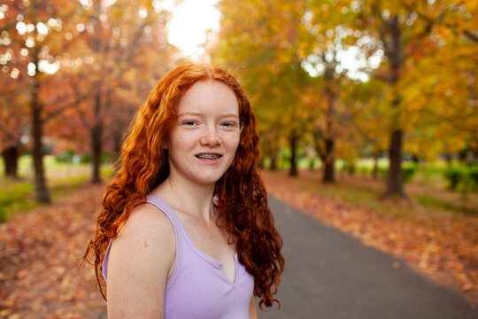 Teenage girl standing in a street lined with Autumn trees