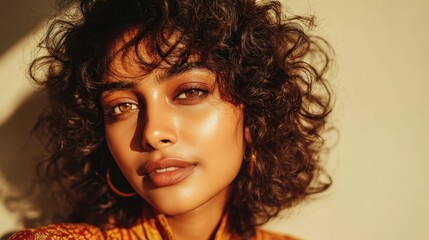 Intimate portrait of a topless woman with messy curls and freckles, savoring a serene moment in warm natural light.