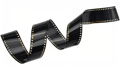 Black film strip curls and curves against a stark white background, showcasing frames